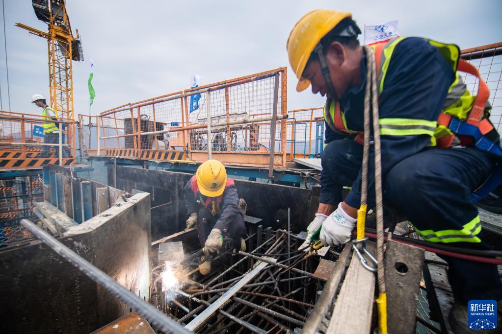 9月20日,在安化縣馬路口資水特大橋施工現場,工人在進行主墩封頂作業。