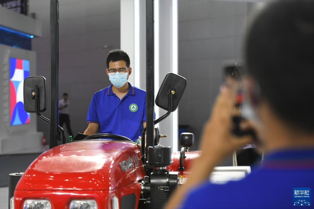 9月20日,來自安徽農(nóng)業(yè)大學(xué)的學(xué)生在2022世界制造業(yè)大會(huì)參觀農(nóng)機(jī)展。