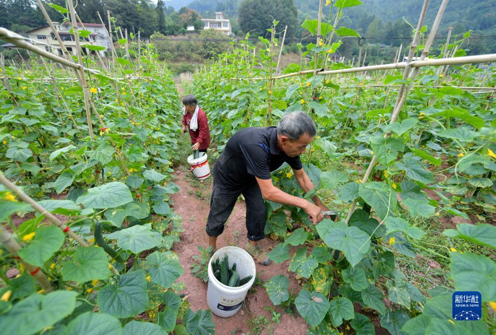 9月20日,宣恩縣萬寨鄉(xiāng)芷藥坪村村民在采收黃瓜。