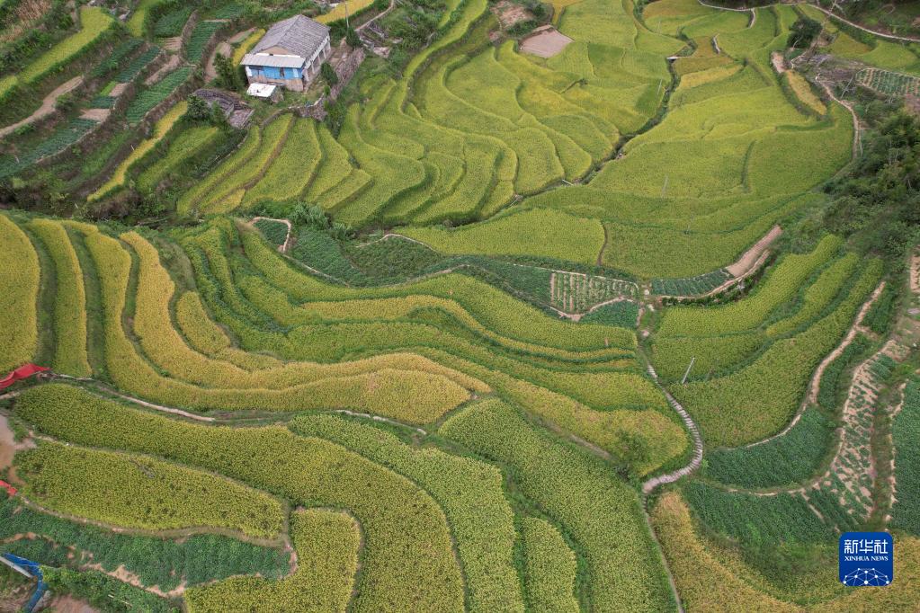 9月15日在浙江省瑞安市林川鎮英山村拍攝的進入成熟期的水稻(無人機照片)。
