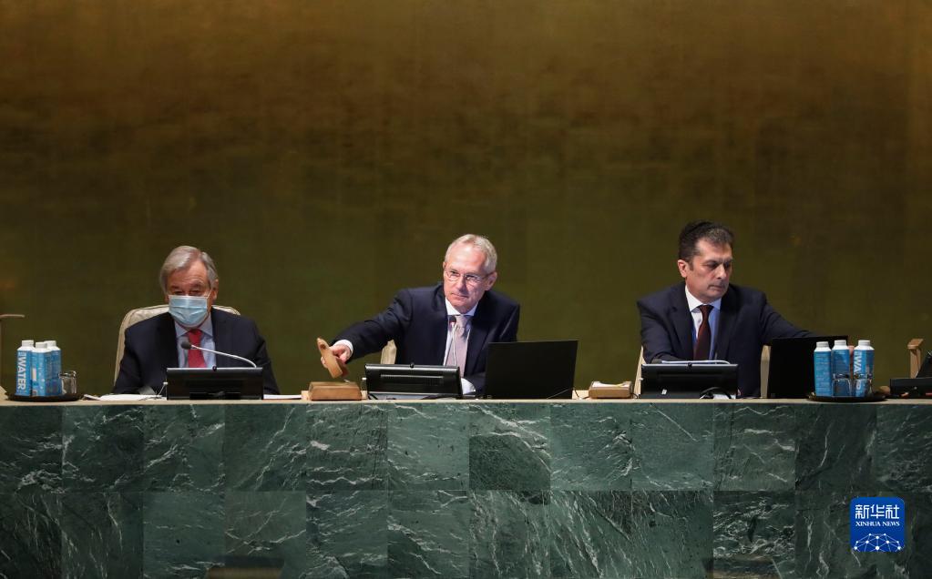9月20日,在位于紐約的聯(lián)合國總部,第77屆聯(lián)合國大會主席克勒希(中)主持聯(lián)合國大會一般性辯論開幕式。