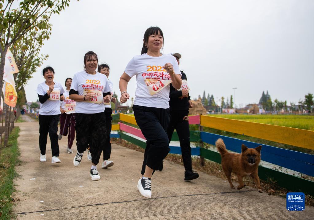 9月21日,在益陽市南縣麻河口鎮東勝村,當地村民和游客在參加“美麗鄉村健康跑”活動。