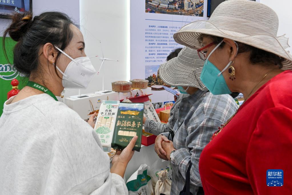 9月21日,在第七屆中國-亞歐博覽會上,參展商(左)向參觀者介紹展品。