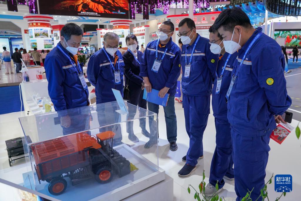 9月21日,在第七屆中國-亞歐博覽會上,參觀者在烏魯木齊展位了解新疆生產(chǎn)的智能采棉機。