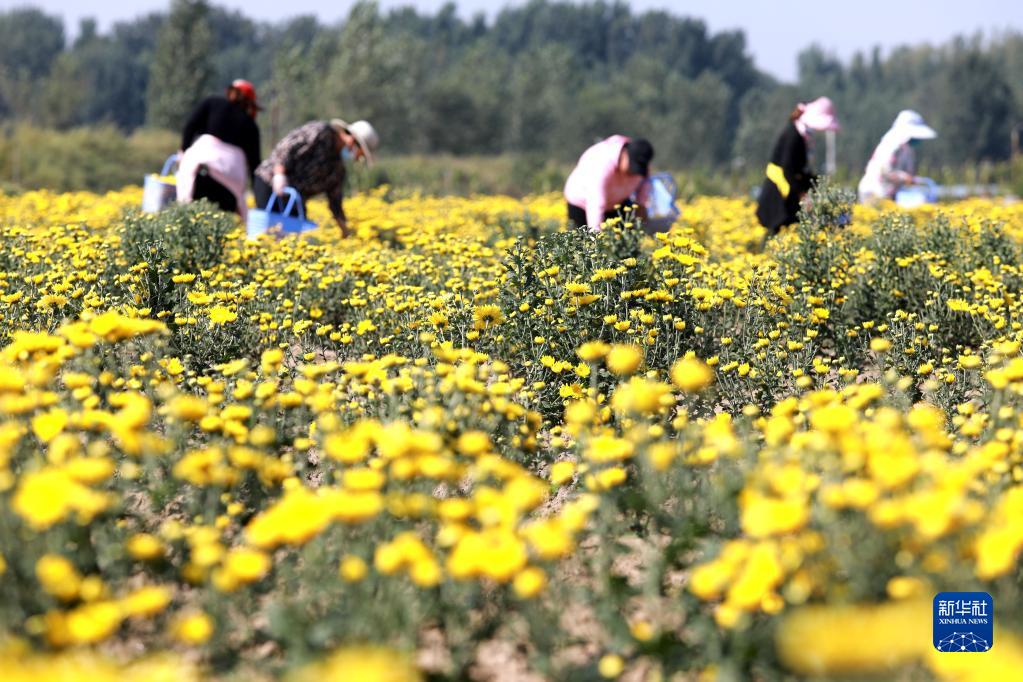 9月21日,在河北省石家莊市行唐縣南橋鎮東安太莊村的千畝皇菊花種植基地,農民在采摘皇菊花。
