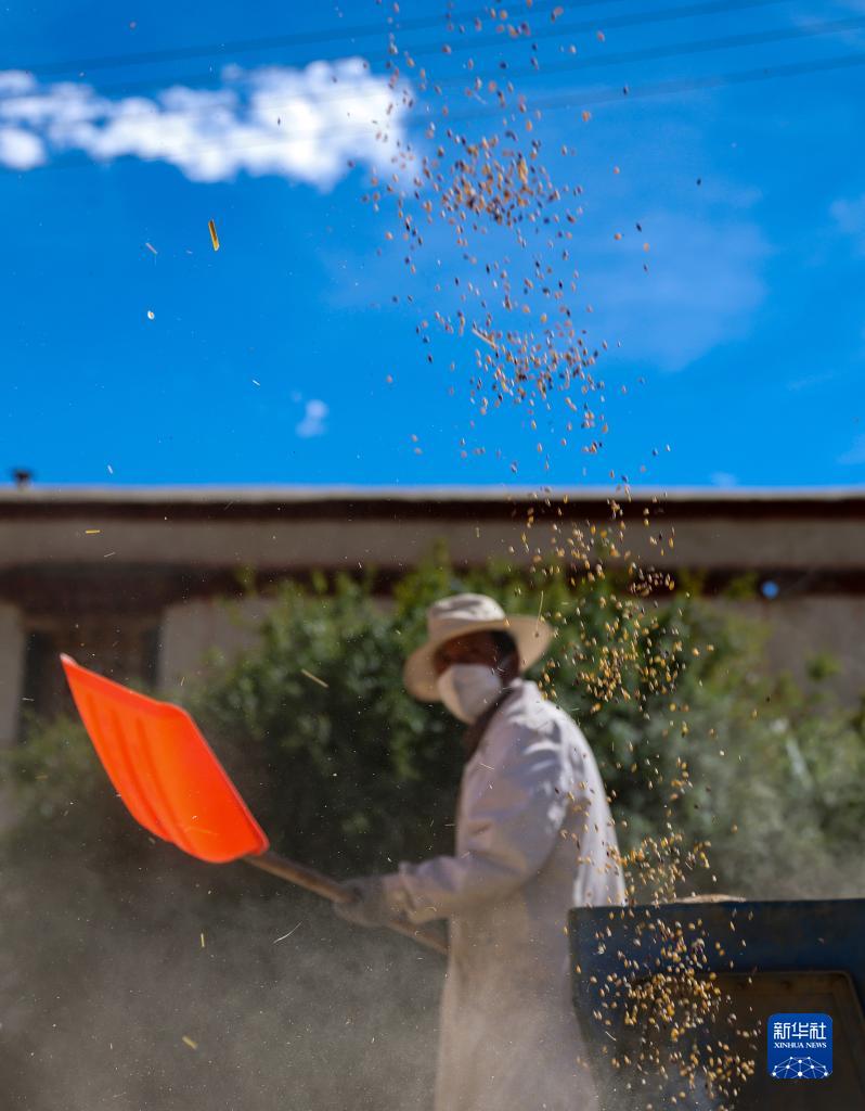 9月21日,拉薩市林周縣江熱夏鄉江夏村的村民在揚場。