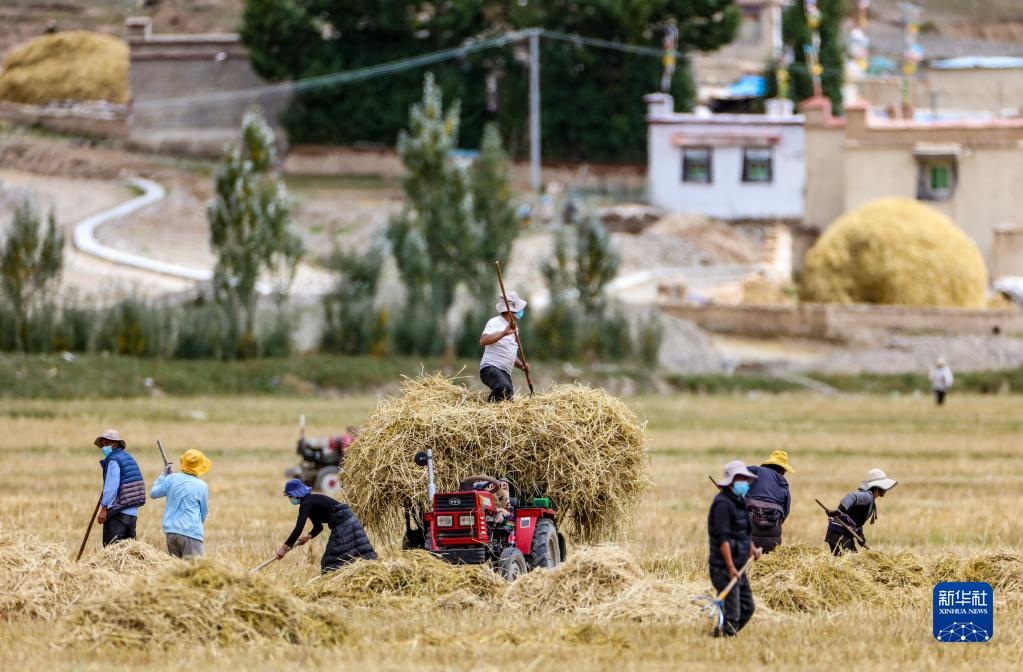 第五個中國農民豐收節在即,西藏自治區拉薩市林周縣的田間地頭一片繁忙。據了解,林周縣目前累計糧食收獲面積為12.43萬畝,已收獲秋糧總產量預估6萬噸,豐收在望。