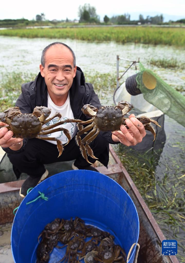陜西漢中市城固縣龍頭鎮明博生態養殖基地養殖大戶王秋林展示捕獲的螃蟹(9月20日攝)。