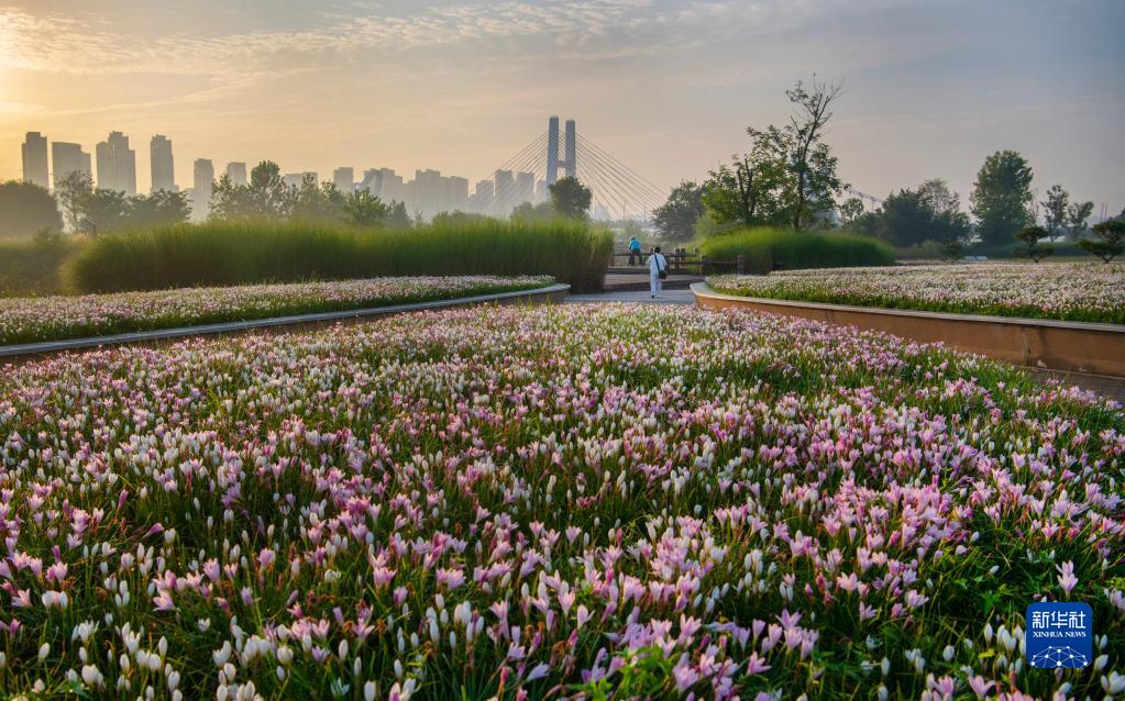 市民在陜西漢中市漢江濕地公園晨練(9月6日攝)。