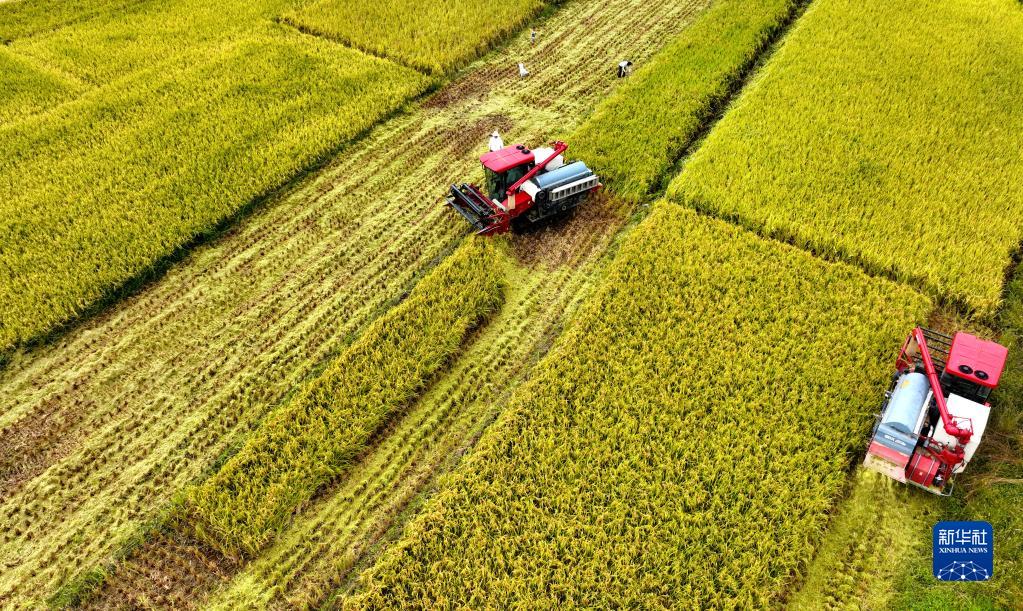 陜西漢中市洋縣戚氏街道八臘廟村村民在收獲水稻(9月10日攝,無人機照片)。近年來,漢中市大力推進“水稻增產擴能提質示范工程”,水稻種植面積常年穩定在120萬畝以上。