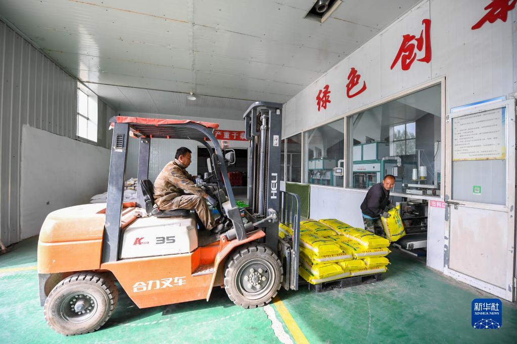 9月22日,內蒙古興安盟烏蘭浩特市義勒力特鎮(zhèn)的明武水稻種植專業(yè)合作社社員駕駛叉車搬運加工好的大米。