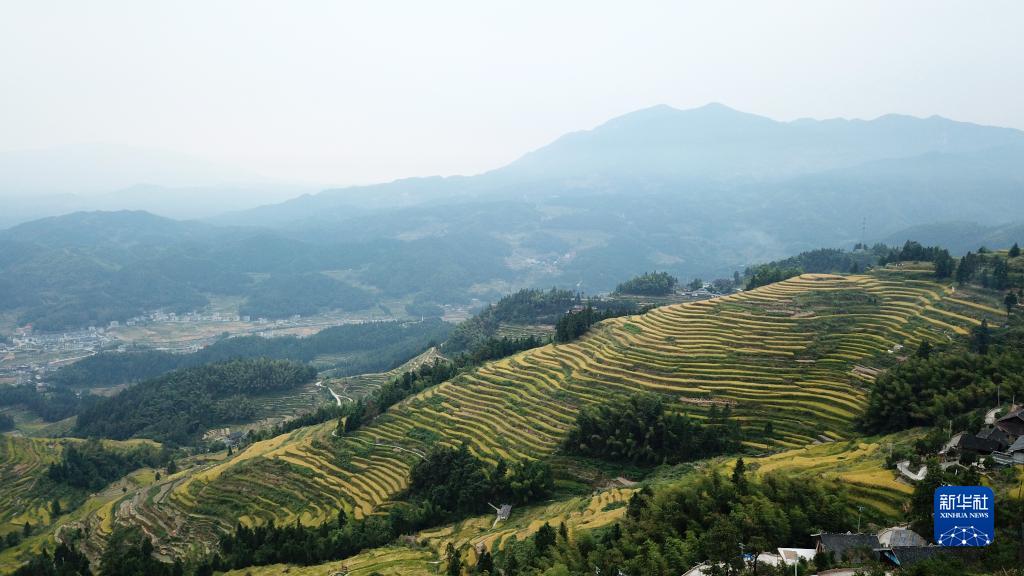 金秋時節(jié),湖南省婁底市新化縣紫鵲界梯田的水稻進入成熟收割期。紫鵲界梯田是世界灌溉工程遺產(chǎn)和全國首批19個重要農(nóng)業(yè)文化遺產(chǎn)之一,梯田層層疊疊連綿起伏。