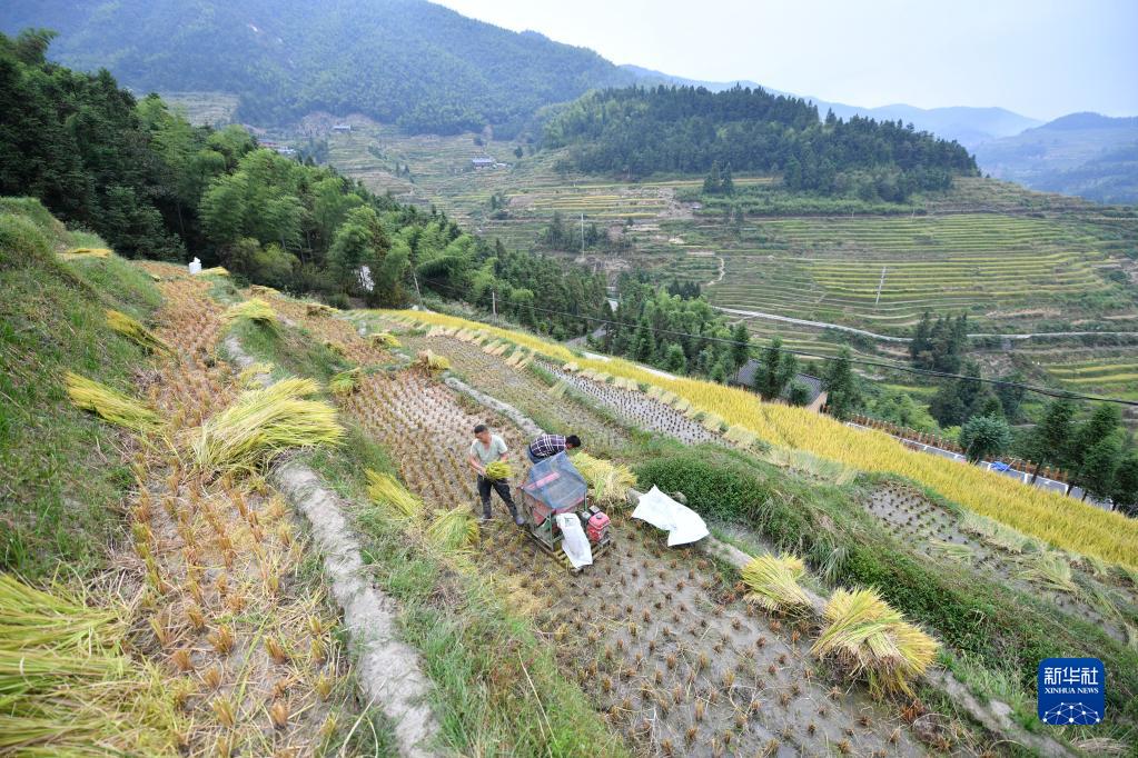 金秋時(shí)節(jié),湖南省婁底市新化縣紫鵲界梯田的水稻進(jìn)入成熟收割期。紫鵲界梯田是世界灌溉工程遺產(chǎn)和全國(guó)首批19個(gè)重要農(nóng)業(yè)文化遺產(chǎn)之一,梯田層層疊疊連綿起伏。