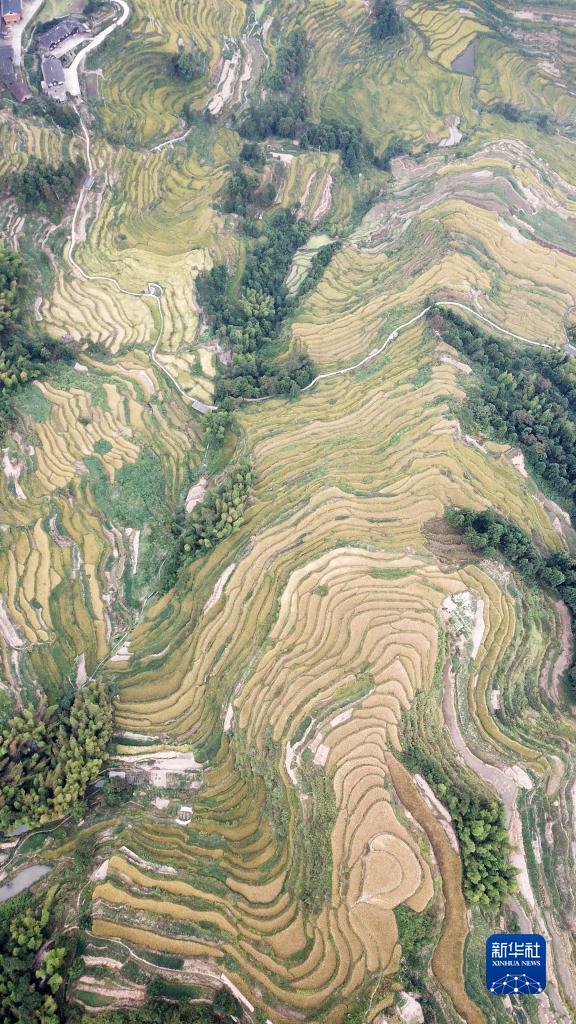 金秋時(shí)節(jié),湖南省婁底市新化縣紫鵲界梯田的水稻進(jìn)入成熟收割期。紫鵲界梯田是世界灌溉工程遺產(chǎn)和全國首批19個(gè)重要農(nóng)業(yè)文化遺產(chǎn)之一,梯田層層疊疊連綿起伏。