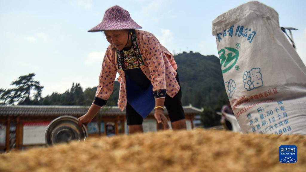 9月21日,在融水苗族自治縣紅水鄉(xiāng)良隴村,村民在收取晾曬的稻谷。