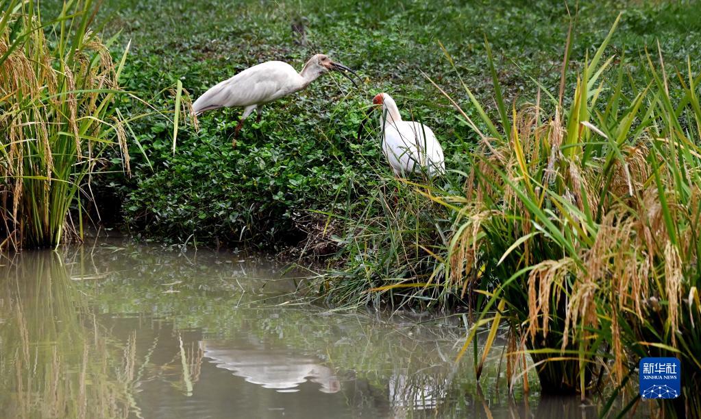 陜西省漢中市洋縣位于秦嶺南麓、漢中盆地東緣,是世界聞名的“朱鹮之鄉”。目前當地生活的朱鹮有7000多只,秋收時節,朱鹮在田間飛舞嬉戲,構成一幅自然和諧的田園美景。