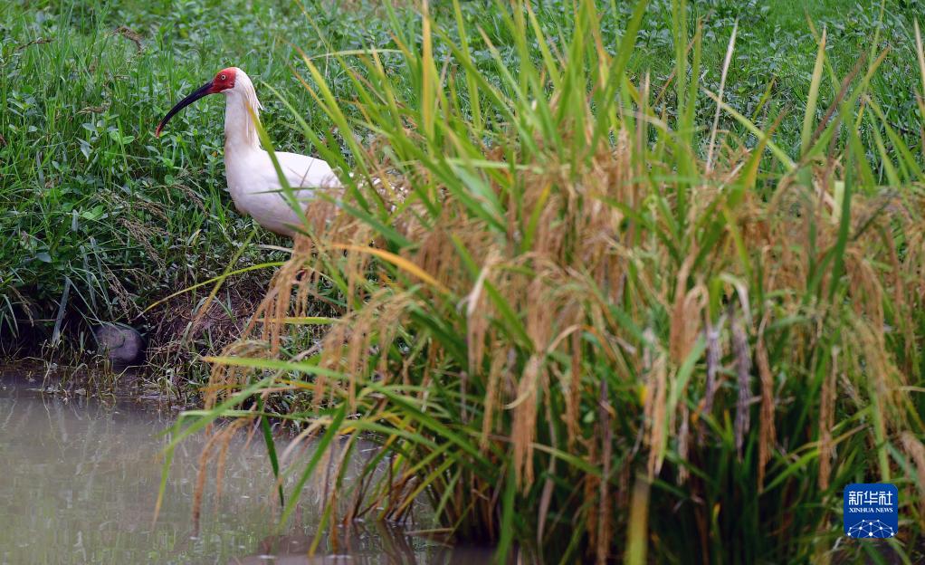 9月22日,一只朱鹮在洋縣紙坊街道草壩村朱鹮保護(hù)區(qū)的稻田里覓食。