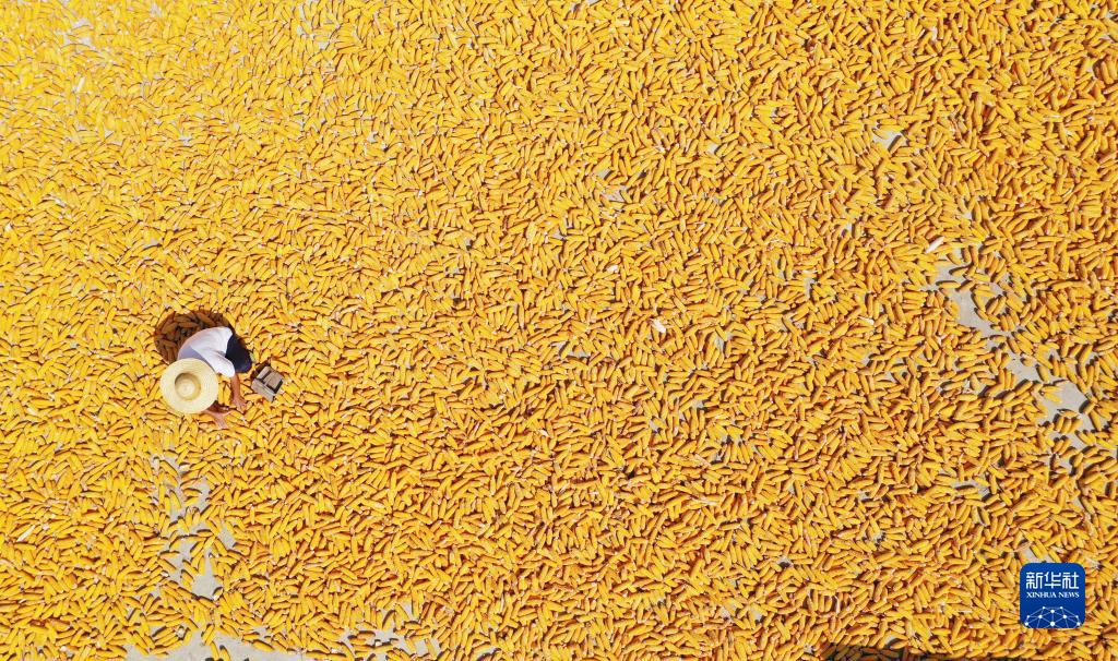 9月22日,在山東省臨沂市郯城縣郯城街道,農(nóng)民晾曬收獲的玉米(無(wú)人機(jī)照片)。
