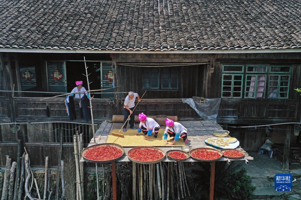 9月14日,在廣西龍勝各族自治縣龍脊鎮(zhèn)龍脊古壯寨,壯族群眾在晾曬谷子和辣椒。
