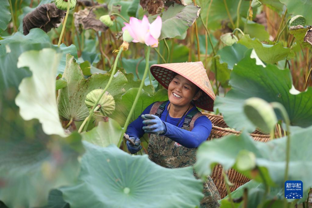 9月22日,在貴州省遵義市余慶縣子營街道上里社區(qū),村民在荷塘里采摘蓮蓬。