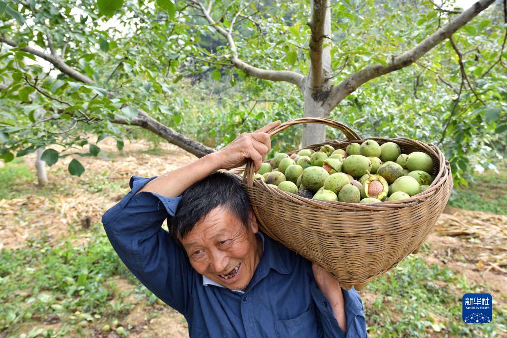 9月15日,在湖北省襄陽市保康縣店埡鎮大林村核桃種植基地,村民搬運采收的鮮核桃。