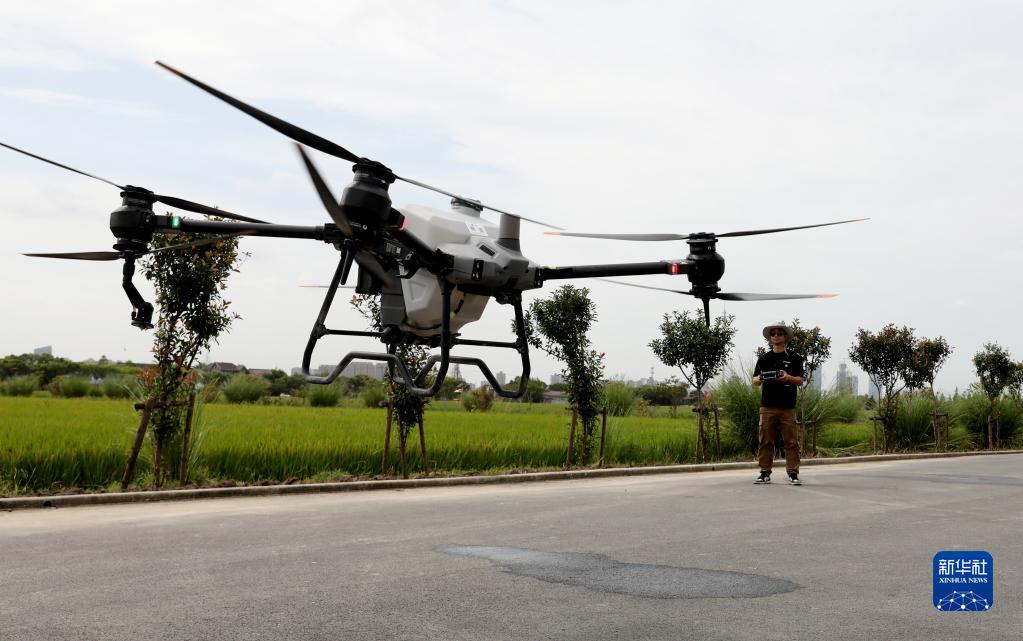 9月21日,上海嘉定區(qū)外岡鎮(zhèn)的數(shù)字化無人農(nóng)場的技術(shù)員孫佳赟操作植保無人機(jī)起飛。這個農(nóng)場通過智慧管理云平臺,實現(xiàn)包括插秧機(jī)、拖拉機(jī)、自走式打藥機(jī)、收割機(jī)等農(nóng)業(yè)作業(yè)機(jī)械的無人化,十多人的團(tuán)隊就可以耕種1600畝水稻。