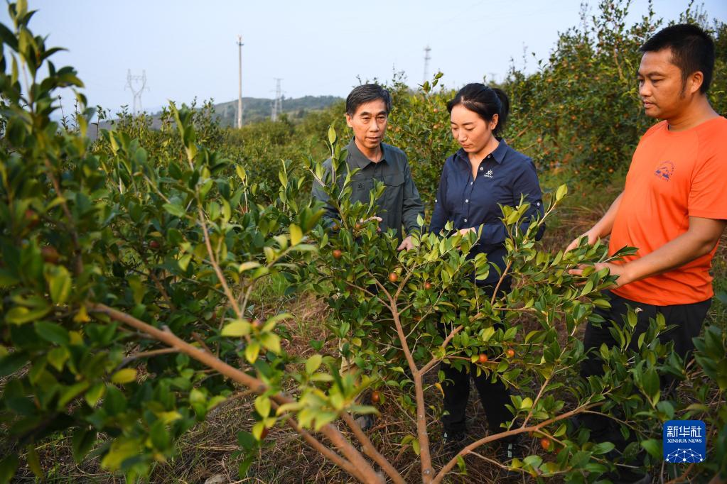 9月21日,在廣東韶關(guān)樂昌市梅花鎮(zhèn)梅花村,白拉曲珍(中)和師傅江建發(fā)(左)、同事伍國清在石漠化綜合治理的油茶種植基地查看油茶生長情況。