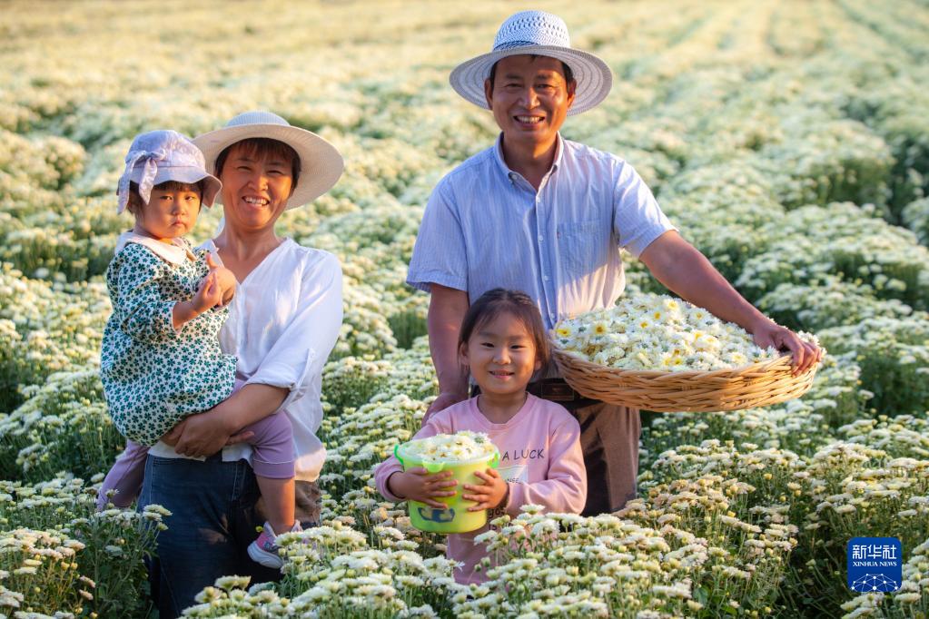 9月21日,在山東省淄博市高青縣黑里寨鎮黑二村,“70后”張新廣(右一)和家人在菊花田間合影留念。張新廣2019年流轉土地100畝建起家庭農場,發展中藥材種植,年收入60萬元。