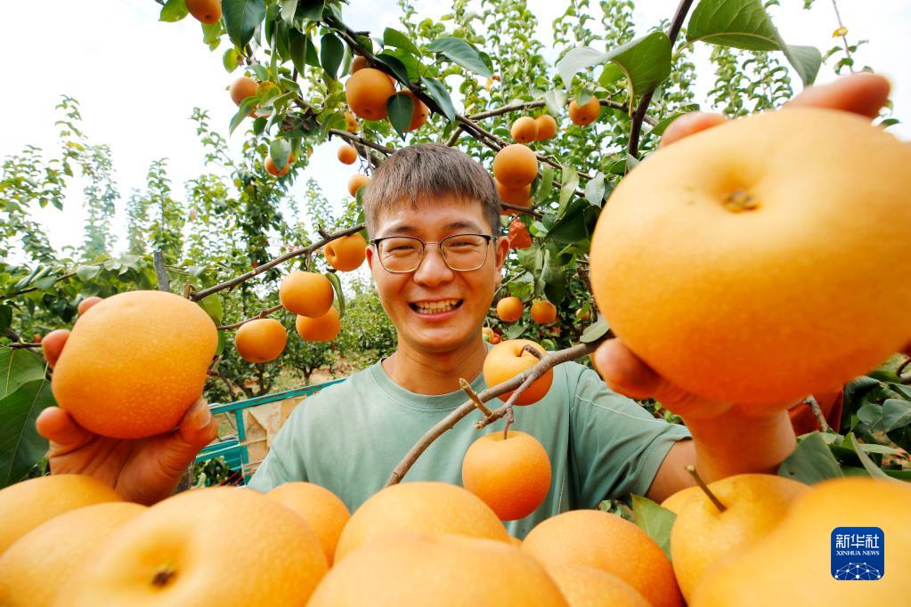 9月19日,在河南駐馬店市驛城區春興種植合作社,“90后”李彬采摘成熟的梨子。李彬返鄉創業從事瓜果種植,引種的有梨、黃桃、羊角蜜瓜等品種,分季上市。最近,他種植的3000畝梨子喜獲豐收。