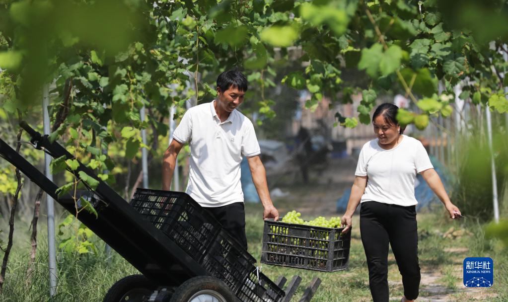 9月16日,在河南省焦作市武陟縣圪垱店鎮馮村,“80后”崔小亮和妻子將采摘好的葡萄裝車。今年他們的葡萄產量預計達2萬斤。