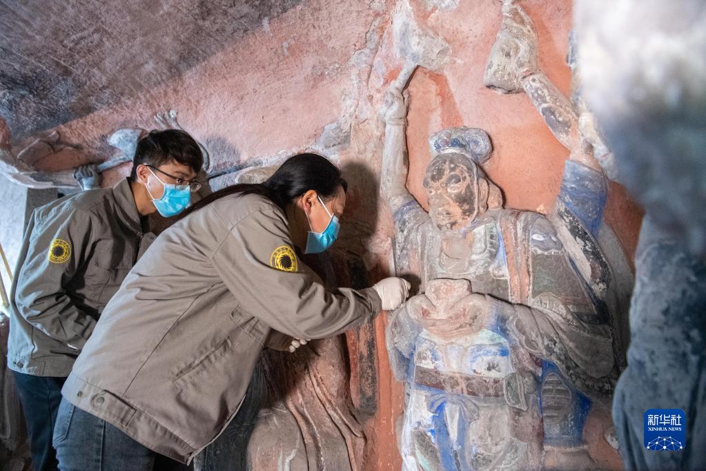 9月22日,大足石刻研究院保護工程中心的工作人員對舒成巖摩崖造像進行本體修復(fù)。