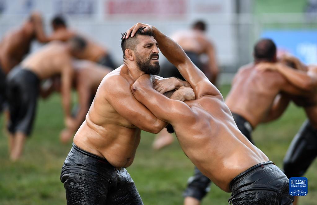 9月18日,選手們在土耳其伊斯坦布爾參加傳統(tǒng)的橄欖油摔跤比賽。