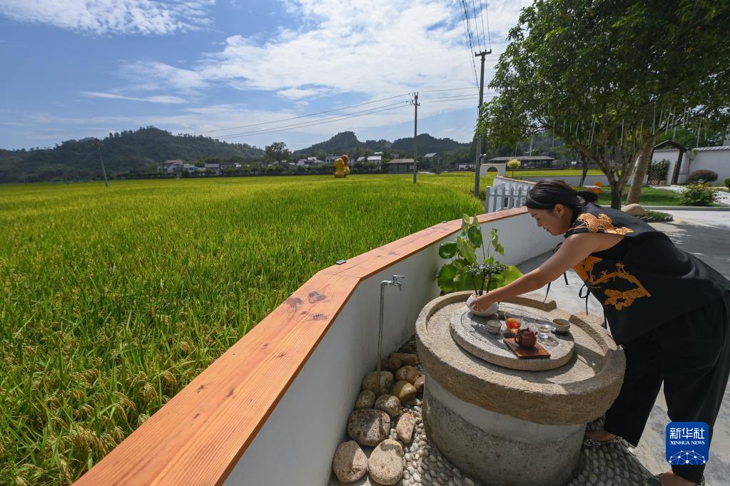 9月24日,羅虹在太陽鎮(zhèn)太陽村稻田邊的“稻香別院”特色餐廳院子內(nèi)擺放茶具。今年上半年羅虹與合伙人一起在太陽鎮(zhèn)太陽米稻田基地旁邊租下一幢空置的房屋,打造集田園觀光、休閑、餐飲為一體的稻香特色餐廳。