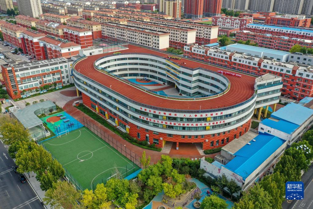 這是9月20日拍攝的齊河縣第六小學(無人機照片)。這所地處鬧市的學校將地下停車、地上教學、運動場地分層穿插布局巧妙融合,節地率達到54%。