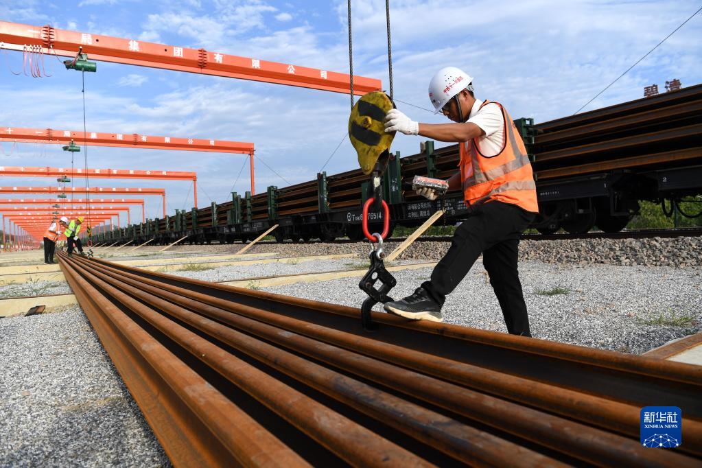 9月24日,在中鐵十一局池黃鐵路鋪軌基地,工作人員進行卸軌作業。