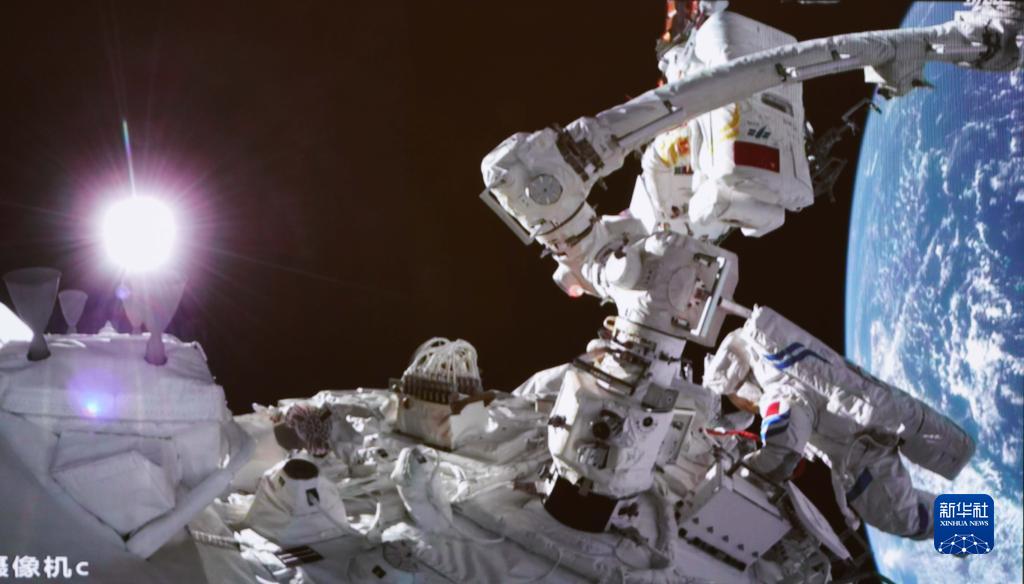 9月17日在北京航天飛行控制中心拍攝的神舟十四號航天員蔡旭哲(上)、陳冬(下)同時在艙外操作的畫面。據中國載人航天工程辦公室消息,當日13時35分,航天員蔡旭哲成功開啟問天實驗艙氣閘艙出艙艙門。