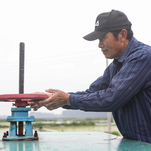 王炳軍在操作灌溉稻田的設備水閥(2022年6月13日攝)。