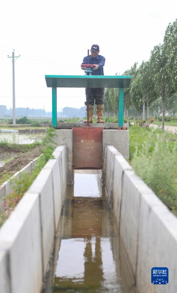 王炳軍在操作灌溉稻田的設備水閥(2022年6月13日攝)。