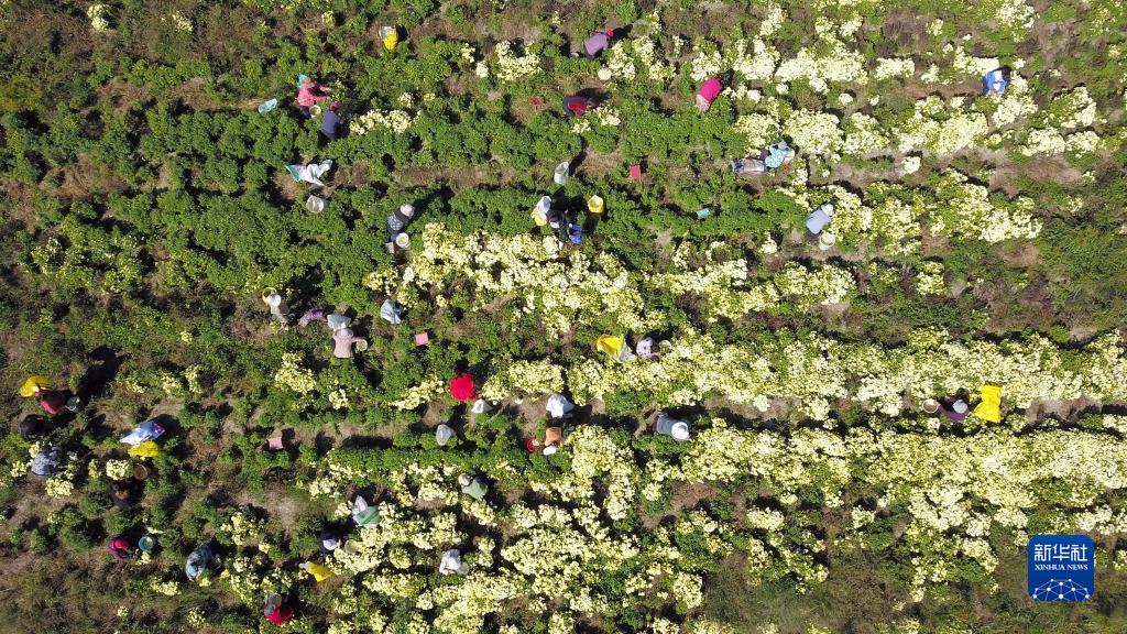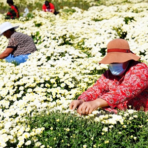 9月23日,在惠民縣姜樓鎮誠至農牧專業合作社,村民在采摘北京菊(無人機照片)。