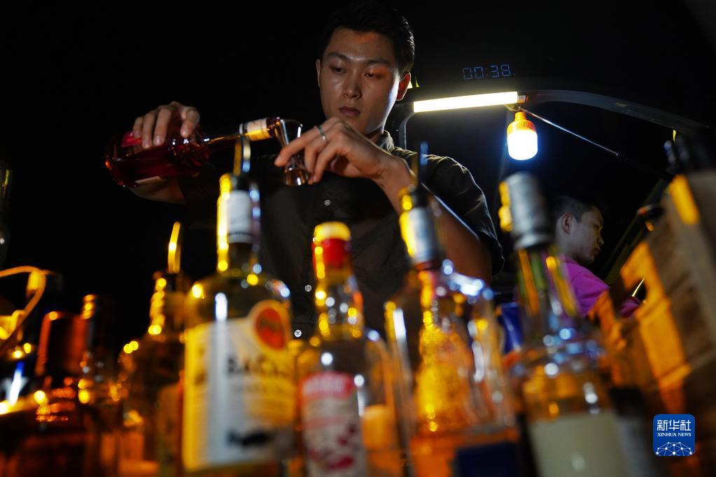 在南昌市紅谷灘區的一處空地,呂琦飛在為客人調酒(9月22日攝)。