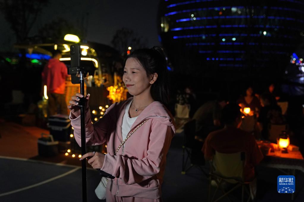 在南昌市紅谷灘區的一處空地,況美婷在小攤前做直播與網友互動(9月22日攝)。