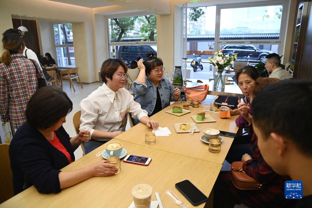 9月24日,聽障咖啡師陳佳悅(左二)在自己經營的咖啡館里與聽力殘疾人家屬們進行交流。
