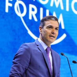 這是2022年5月24日,在瑞士達沃斯,西班牙首相桑切斯出席世界經濟論壇年會時致辭。