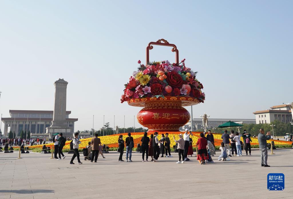 國慶節臨近,“祝福祖國”巨型花果籃亮相北京天安門廣場。今年“祝福祖國”巨型花果籃頂高18米,以喜慶的花果籃為主景,花壇底部直徑48米。