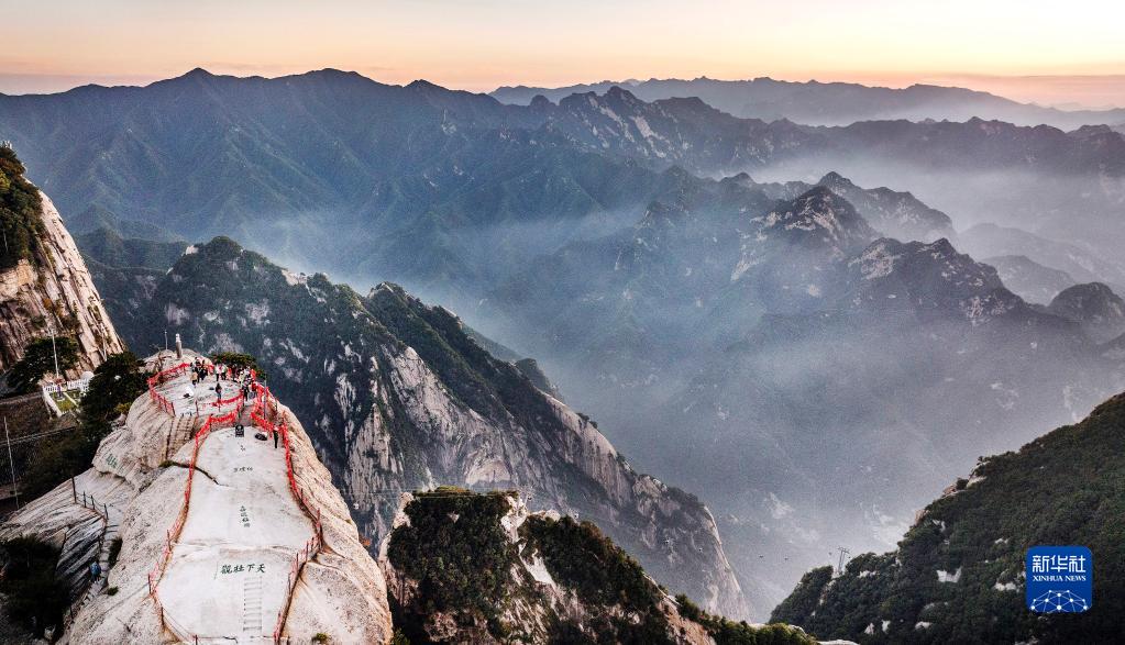 9月25日,游人在西岳華山西峰頂上游覽(無人機照片)。