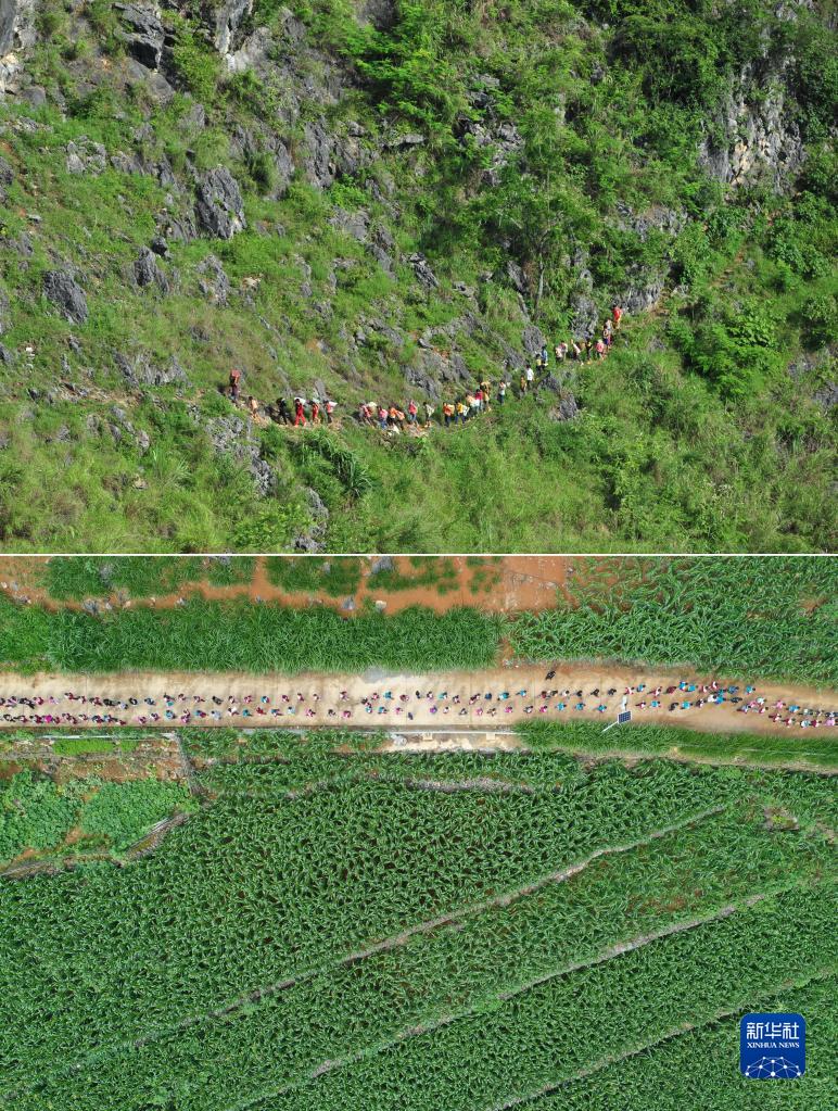 上圖:在廣西大化瑤族自治縣板升鄉(xiāng)弄勇村,孩子們扛著生活用具翻山越嶺回家(2012年7月4日攝);下圖:在弄勇小學大門口,孩子們走在放學路上(2022年5月20日攝,無人機照片)。十年來,弄勇村修通了多條公路,實現(xiàn)屯屯通公路(拼版照片)。