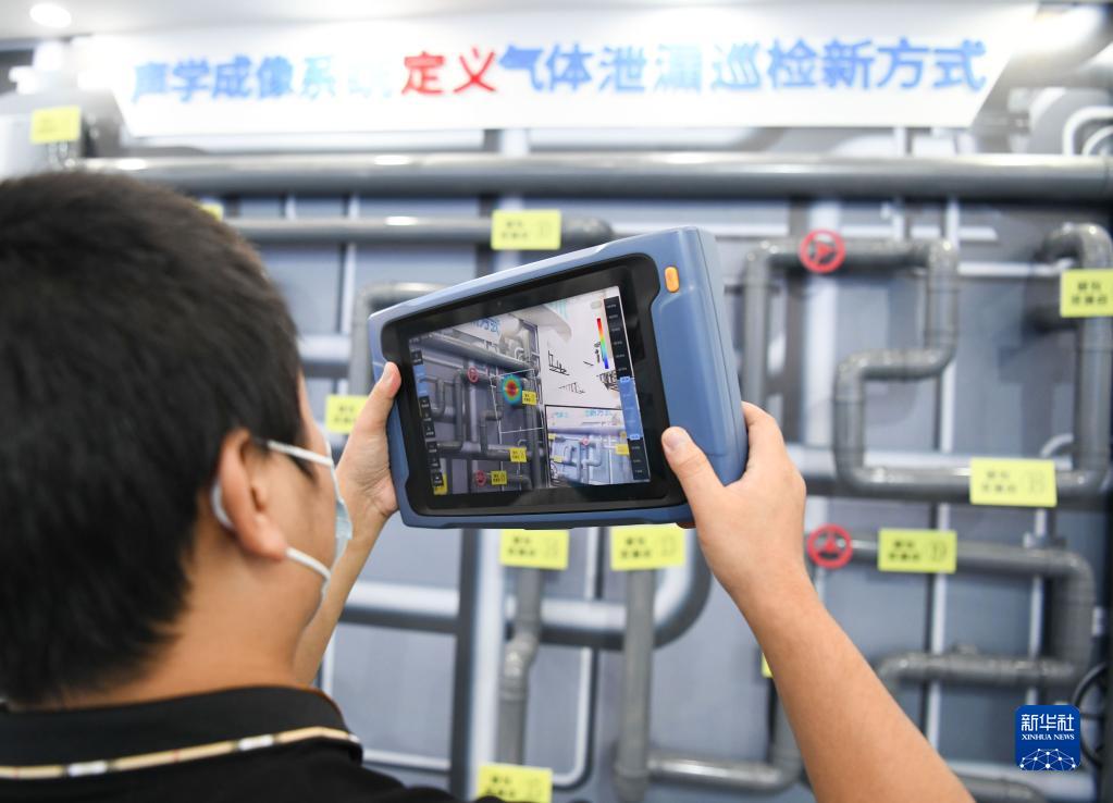 在安徽合肥舉辦的2022世界制造業(yè)大會(huì)上,參展人員在操作一款用于氣體泄漏巡檢的聲學(xué)成像儀(9月22日攝)。