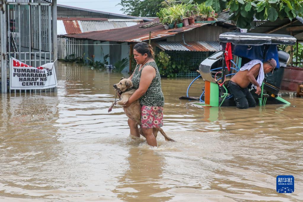 9月26日,在菲律賓布拉干省,一名女子抱著寵物狗涉水出行。