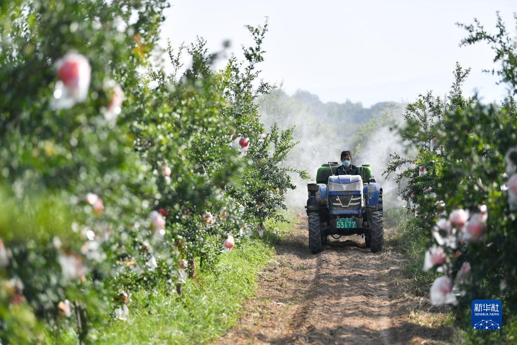 9月26日,工作人員在位于西安市臨潼區(qū)的石榴紅生態(tài)科技園駕駛農(nóng)機對石榴噴灑酵素肥料。
