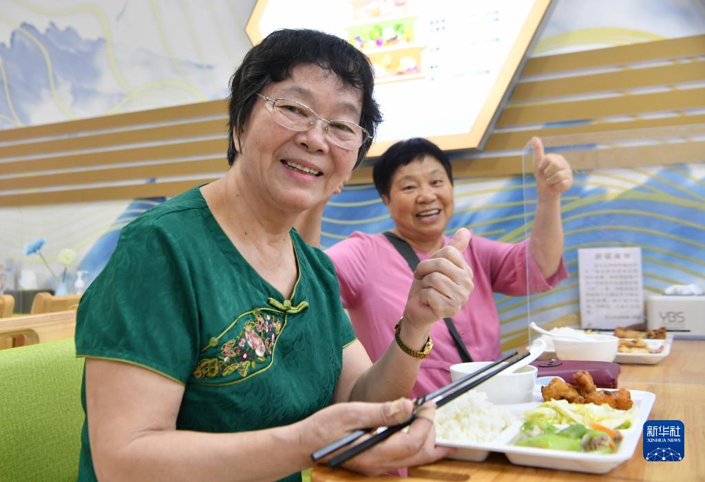 9月27日,在福州市華大街道屏山社區(qū),71歲的黃慶萍(左)和73歲的錢美英為可口的午餐點贊。